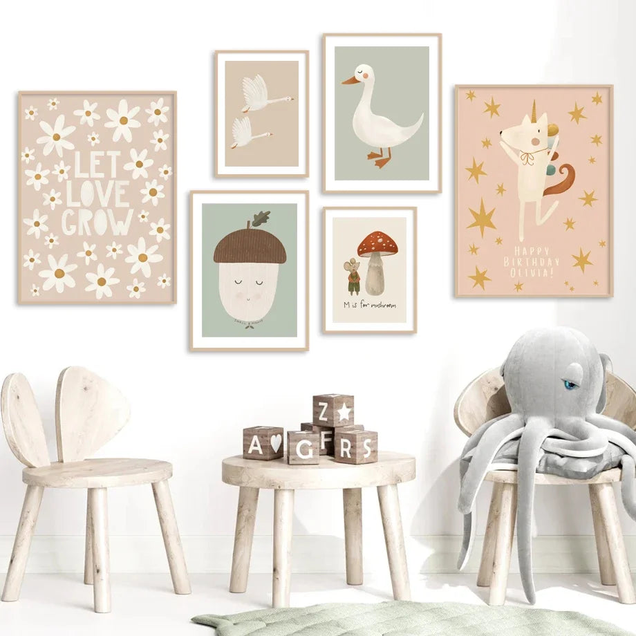 Apportez une note de fraîcheur et de tendresse à la chambre de votre enfant avec ces jolies toiles illustrant de petits canards, des marguerites et des champignons.