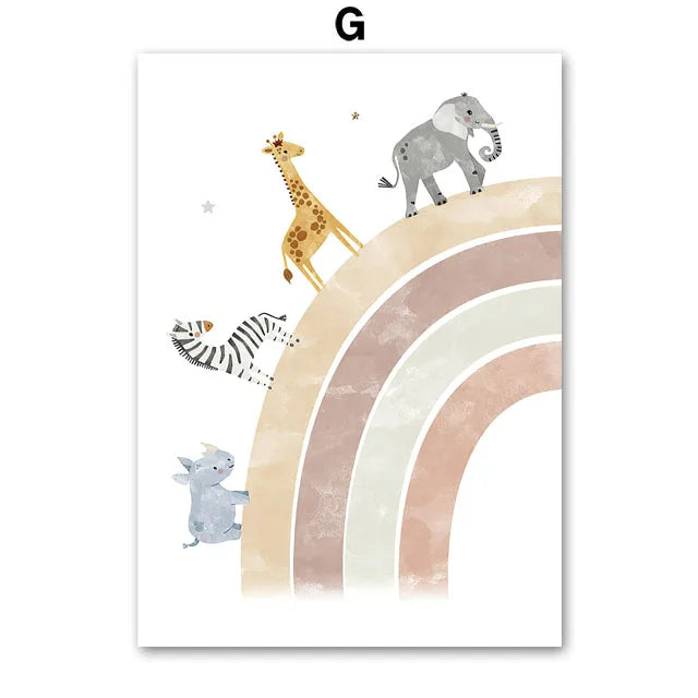 Apportez une touche de rêve et de tendresse à la chambre de votre enfant avec ces jolies toiles murales représentant les animaux de la savane accompagnés d’arc en ciel.